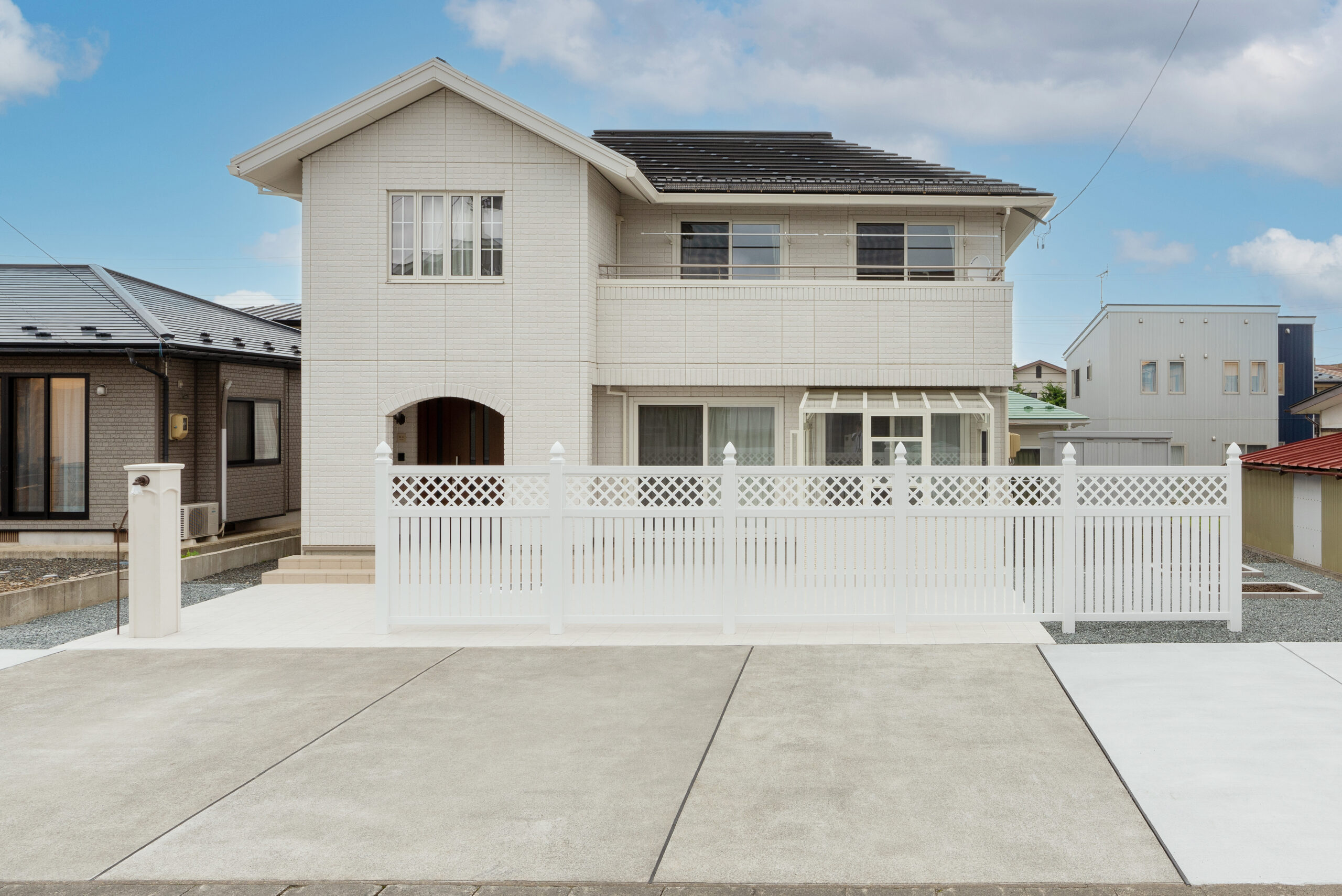 クールなイメージのあるガーデンルームや門柱、目隠しフェンス、タイルに至るまでお客様の雰囲気にあわせたデザインを採用し、お好きな”白”に統一することで大人エレガントな調和のあるお庭になりました。