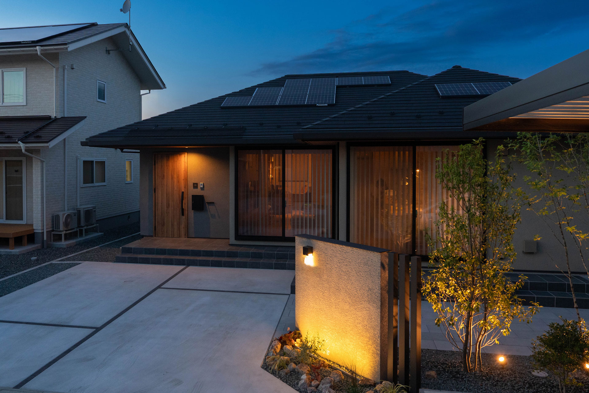 全体のカラーを黒からグレーで統一することで、昼間は植栽の緑が美しく映え、夜は照明の光が際立つ、上質で落ち着きのある空間を演出しています。